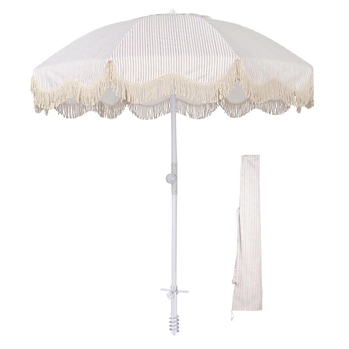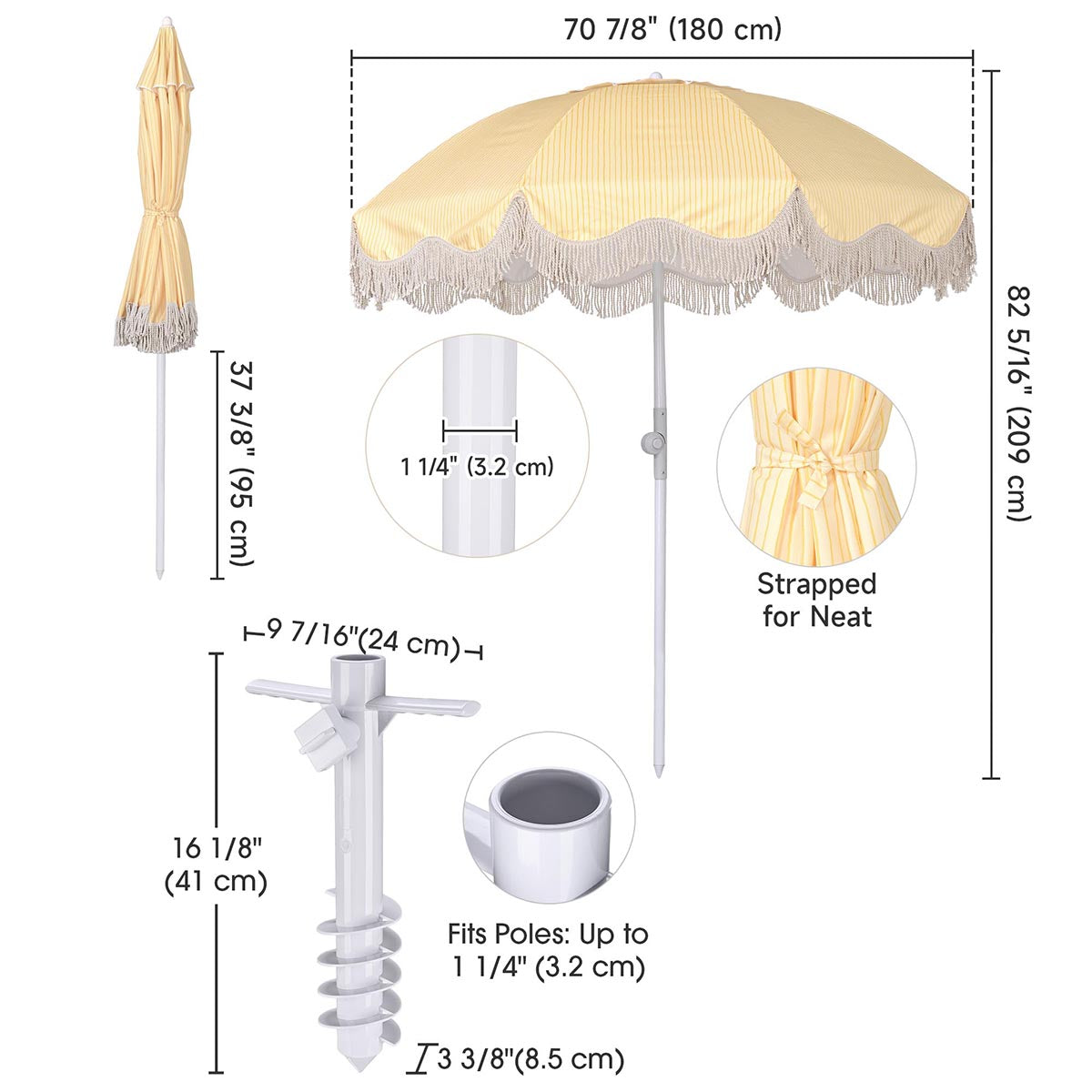 - Striped Umbrella with Sand Anchor - this combo includes a 6ft beach umbrella with cotton fringes and a sand anchor, allowing you to set up the umbrella on the beach securely without tools, easy to enjoy your vocation in summer
