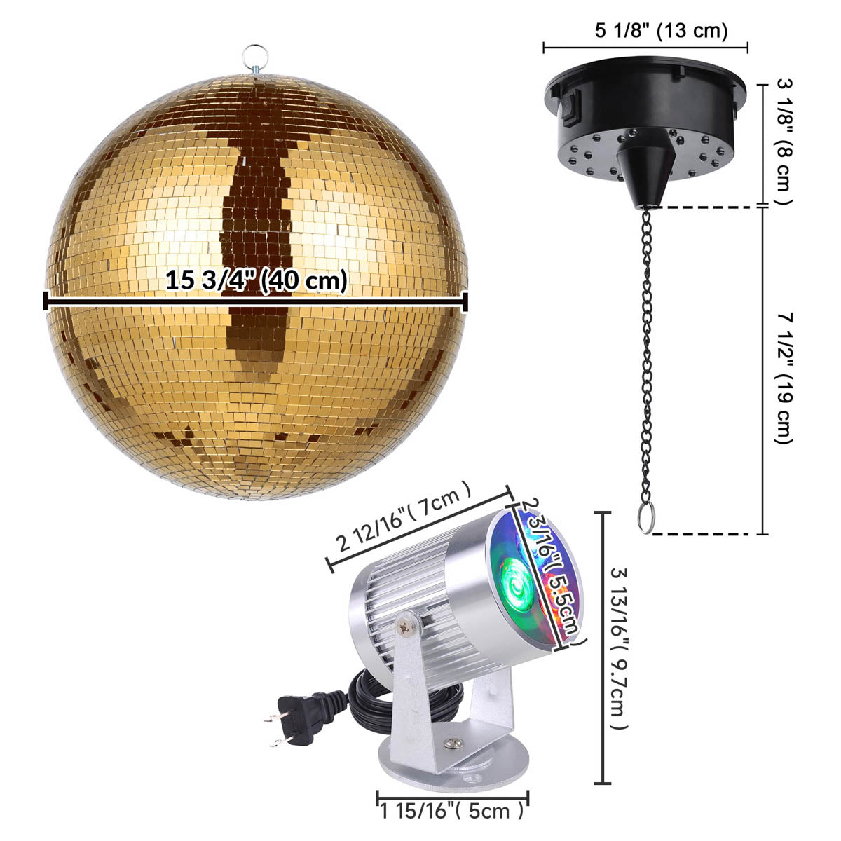 - 16 inch Mirror Ball Dia: 15 3/4" (40cm); Net Weight: 3.8 Lbs