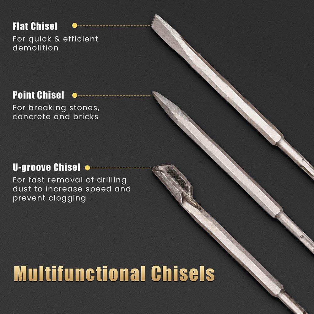 - Point chisel & flat chisel for breaking, demolition, U-groove chisel removes drilling dust easily