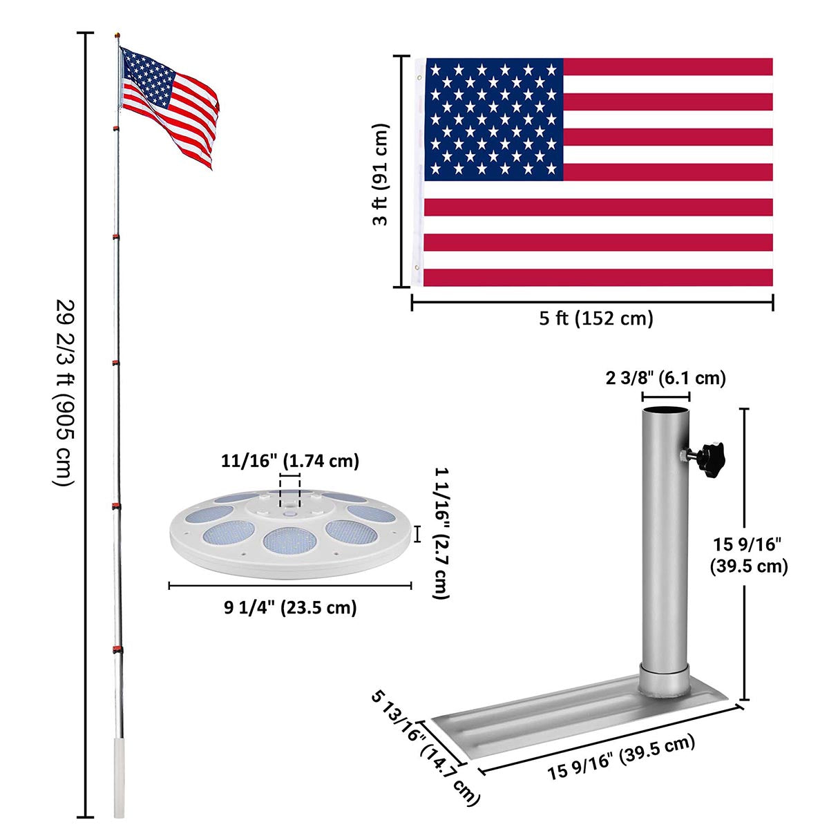 DIY Telescoping Solar Light Flagpole Kit - Portable Patriotism, Anywhere! Raise Old Glory in minutes! This all-in-one flagpole kit combines a rust-proof aluminum telescoping pole (size options 20ft, 25ft, 30ft), auto-illuminating solar light, and a tire stand that uses your vehicle's weight for instant stability. No tools, no drilling.