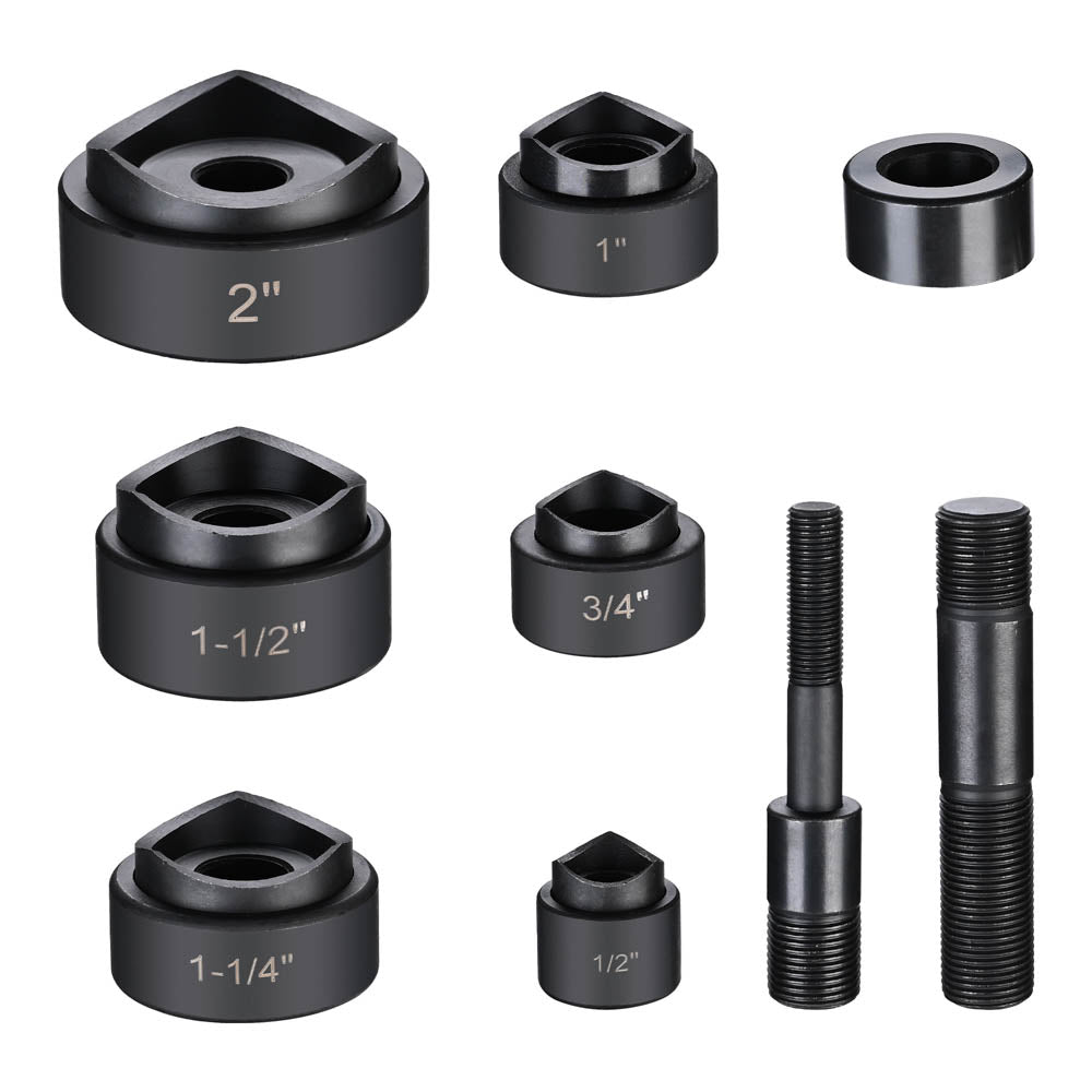 DIY 8-Ton Metal Hole Punch Tool set with 360° Rotating Head –suitable for punching precise holes of different sizes from 1/2", 3/4", 1", 1 1/4", 1 1/2" to 2" on up to 16-gauge stainless steel, 11-gauge iron, steel, aluminum, brass, fiberglass, and plastics, ideal for multiple usages.