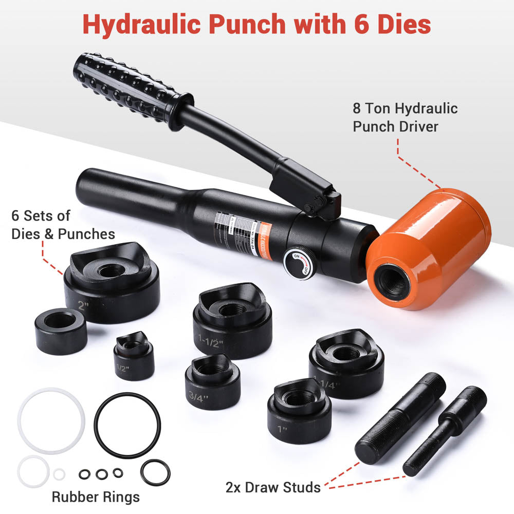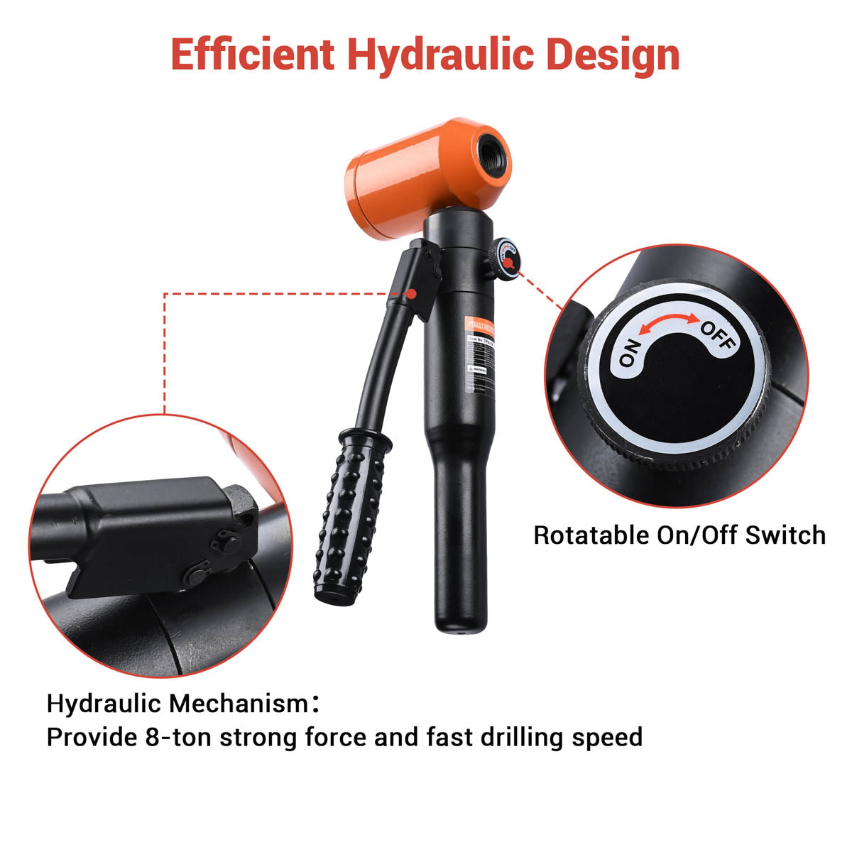 - Crush Stainless Steel & Iron Effortlessly – This 8-ton hydraulic hole punch delivers brute-force precision, slicing clean holes through 16-gauge stainless steel and 11-gauge iron.