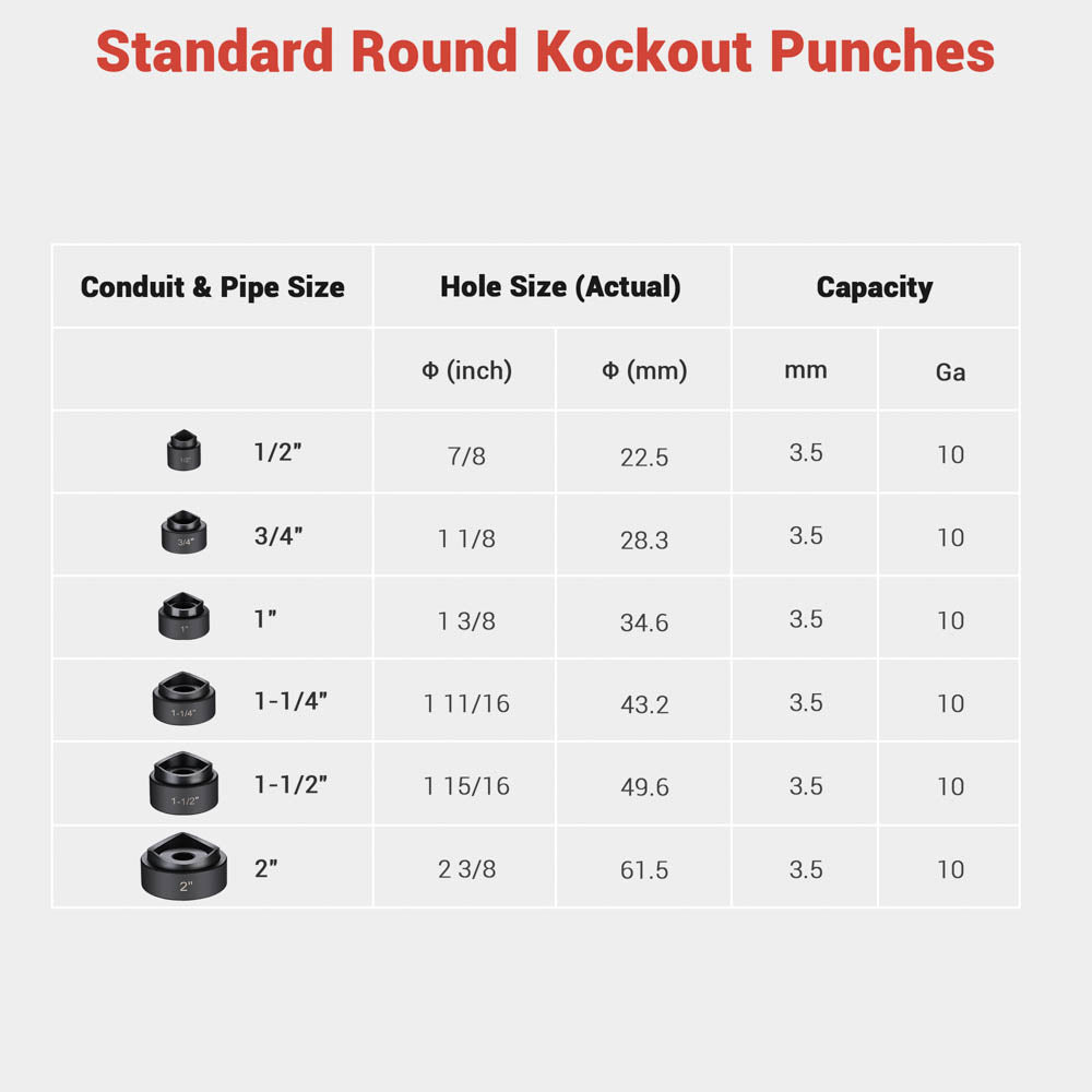 - 6 Sizes, Zero Tool Hassle – Tackle 1/2", 3/4", 1", 1 1/4", 1 1/2", and 2" holes in one kit. Compatible with square dies (1 3/4" Square Knockout Dies sold separately).