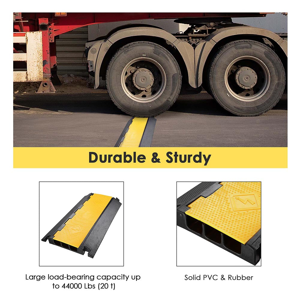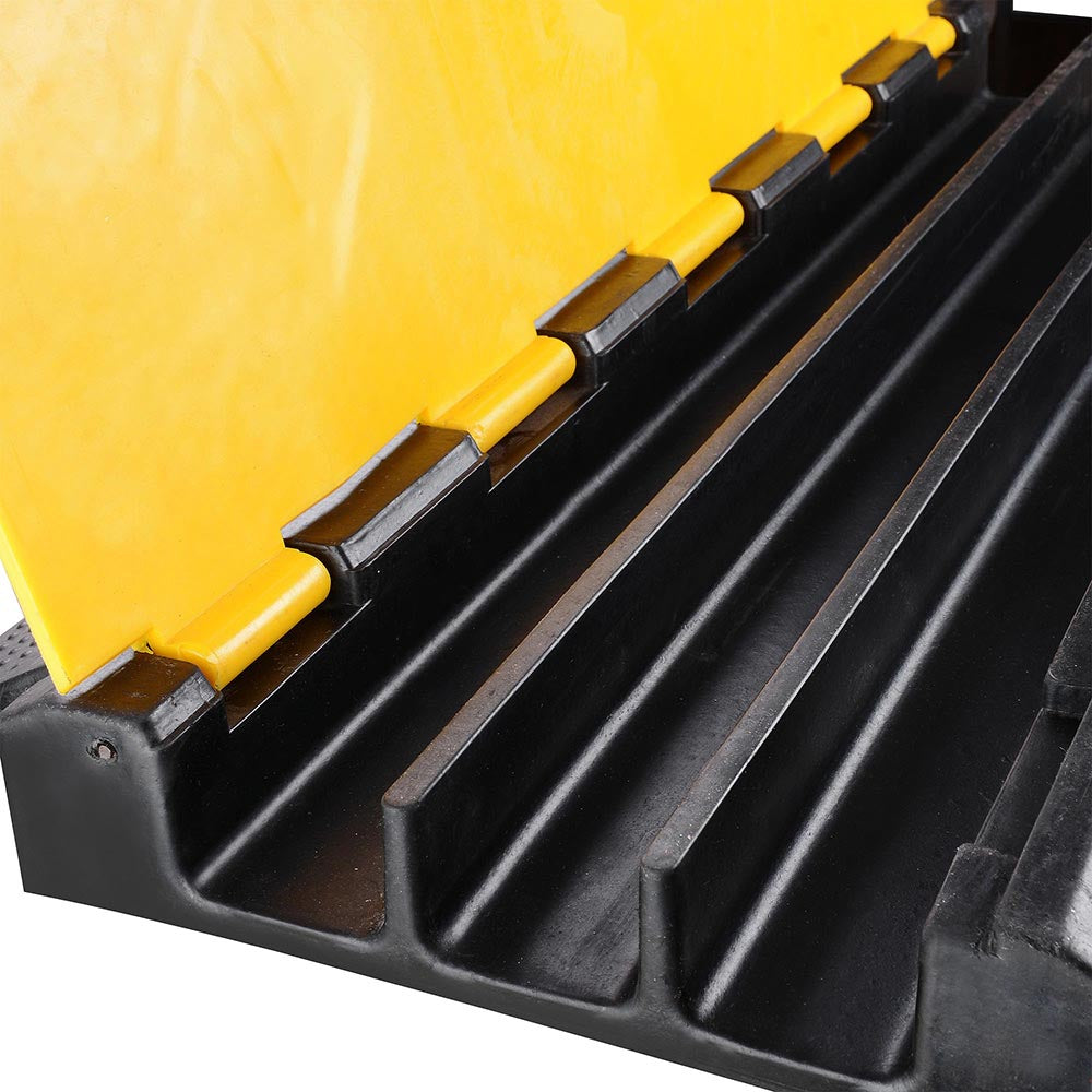 Professional-Grade 3-Channel Cable Protector Ramp for high-capacity cable management. Safely organizes multiple power cords, data cables, and hoses (up to 3 lines) in separate channels. Heavy-duty construction supports up to 20 tons of vehicular traffic. Ideal for concert stages, film sets, construction sites, and industrial warehouses. Features a high-visibility, anti-slip surface and easy-interconnect design.