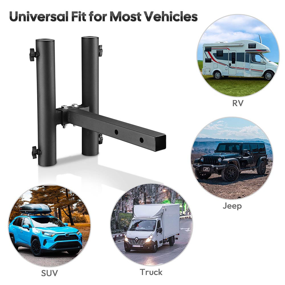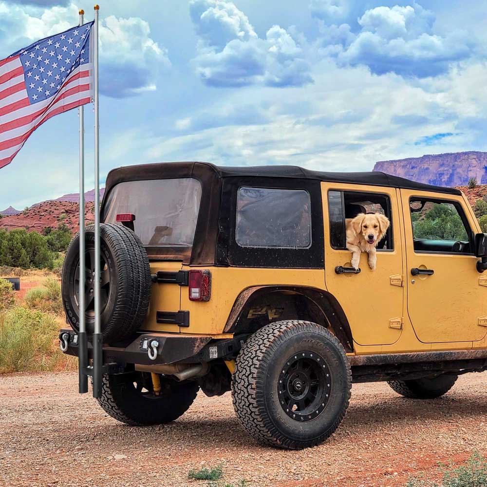 DIY Hitch Flag Pole Mount holds Two Flagpoles and uses for 1 9/16" Receivers, which can be easily installed to jeep, RV, SUV, truck, camper and any vehicle.
