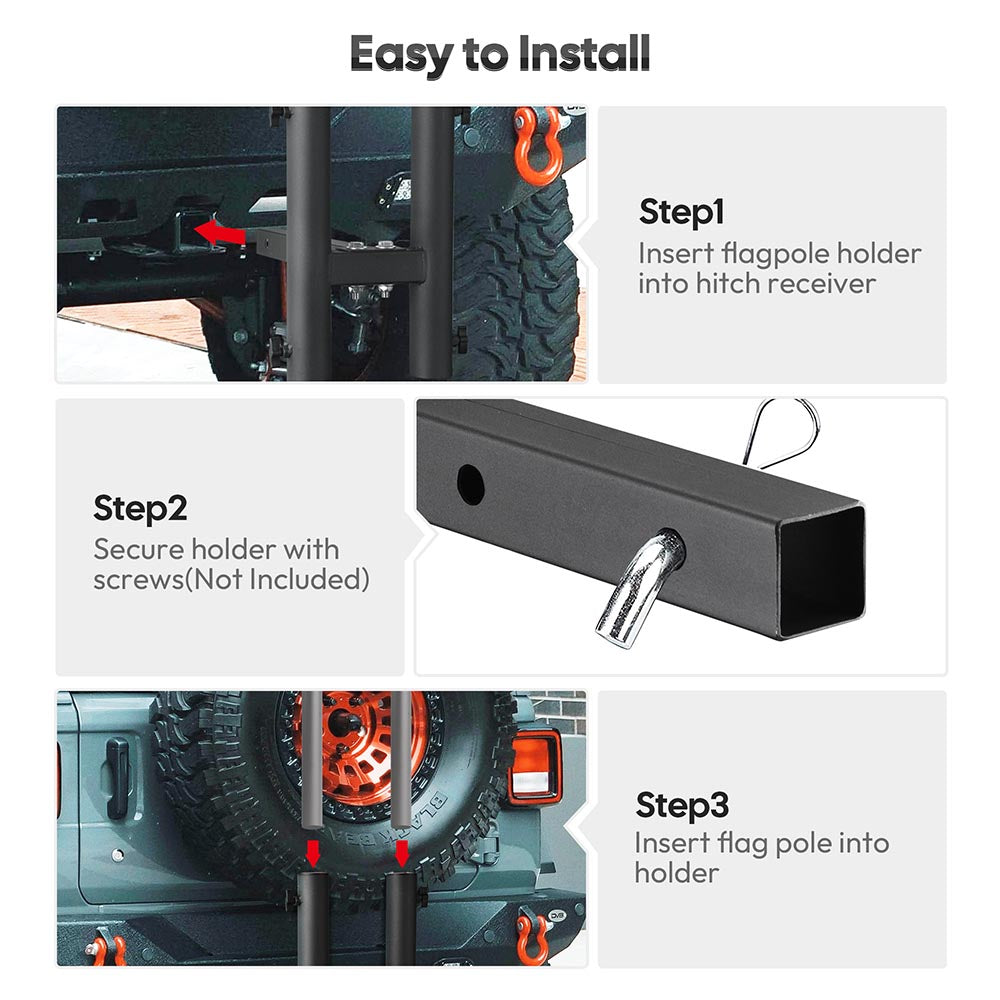 - Insert the holder into car hitch receiver and secure with 2 thumb locking screws, and then insert flag pole from 1 to 2 inch into the holder