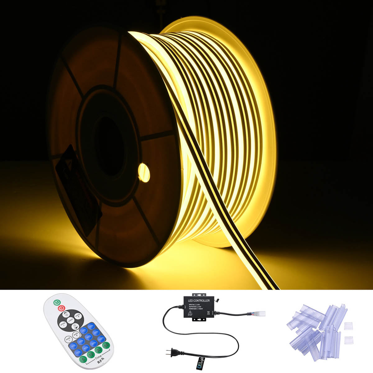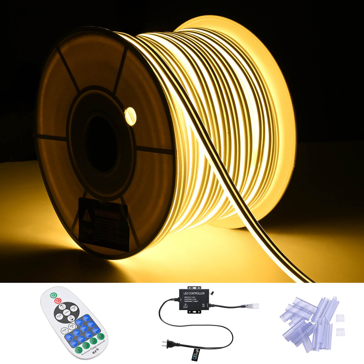DIY Waterproof LED Neon Rope Light Available in 50ft, 100ft, and 150ft sizes, these flexible lights feature a brilliant warm white glow and a unique double-sided, hollow-out design. Perfect for crafting custom signs, accent lighting, dazzling decorations, architectural, holiday decoration for both home and commercial use. Enhance your setup! Customize your design with optional accessories like Corner connectors, Splice connectors, Mounting tracks, or Remote & Controller (sold separately) for seamless turns, extensions, or professional-grade installation.