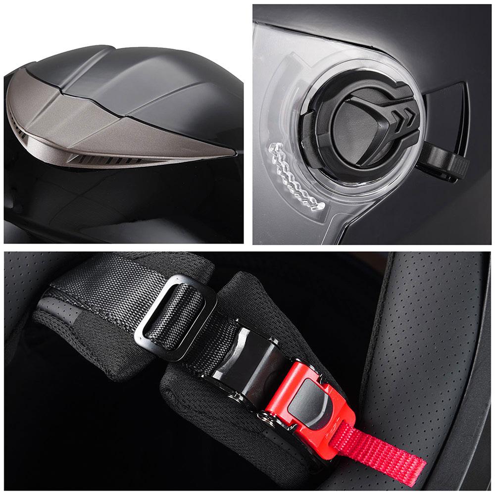 - Built-in Double Visors - Wide visual field clear visor & inner sun visor: tough & high elastic front visor for great impact resistance; internal dark visor for additional eye protection from the sunlight and can be easily controlled with a switch