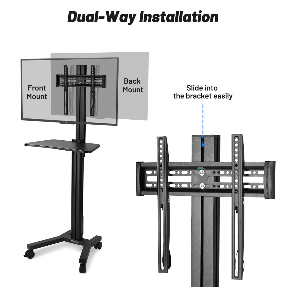 Engineered for lasting performance, The DIY Outlet Rolling TV Cart features thicker, heavy-duty support poles for superior stability and durability. Easily adjust the height to suit any space and securely mount most 32" to 65" TV screens for a versatile and reliable presentation solution.