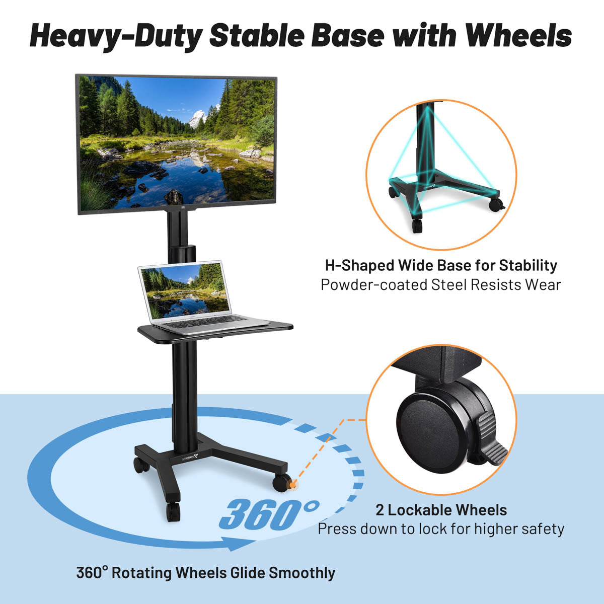 - Smooth-rolling casters make repositioning easy, and two locking wheels ensure the stand stays firmly stationary when needed