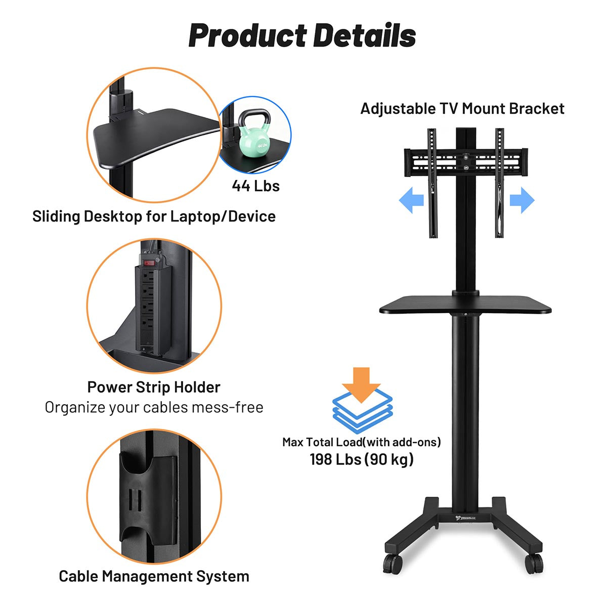 - The reinforced mounting bracket safely supports TVs up to 66 lbs, with a total weight capacity of 198 lbs for added equipment