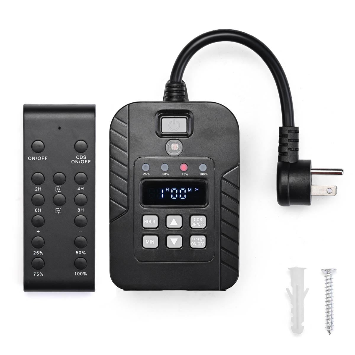 - 2-in-1 Dimmer & Timer - Dimmer for Outdoor String Lights combines the functions of dimmer and timer for ease of use. It offers 4 preset brightness levels (25%-50%-75%-100%) and traditional timer options (2h, 4h, 6h, 8h) for ultimate control, saving time and creating stunning lighting effects