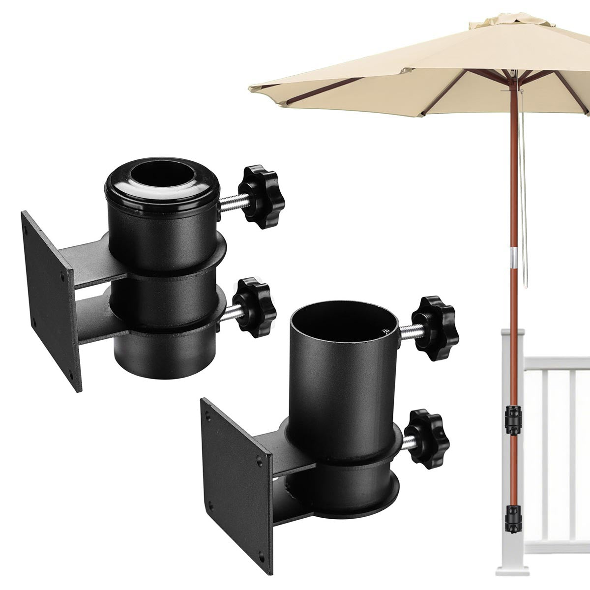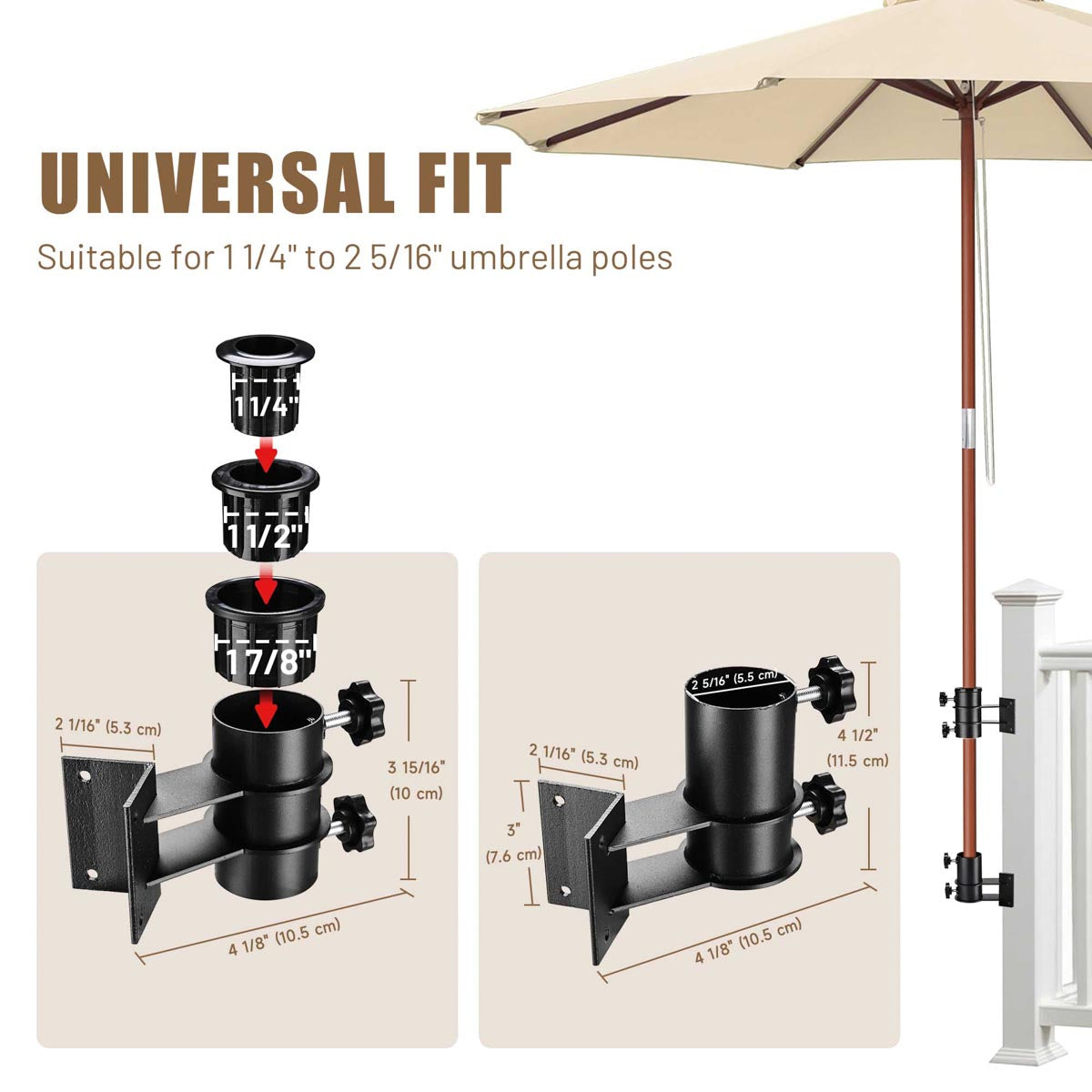 This Patio Umbrella Holder Flat Mount Brackets for deck railing fit umbrella pole between 1 1/4" to 2 5/16" in diameter, enabling reliable shade for deck railing, balcony, fence without the use of bulky parasol stands.